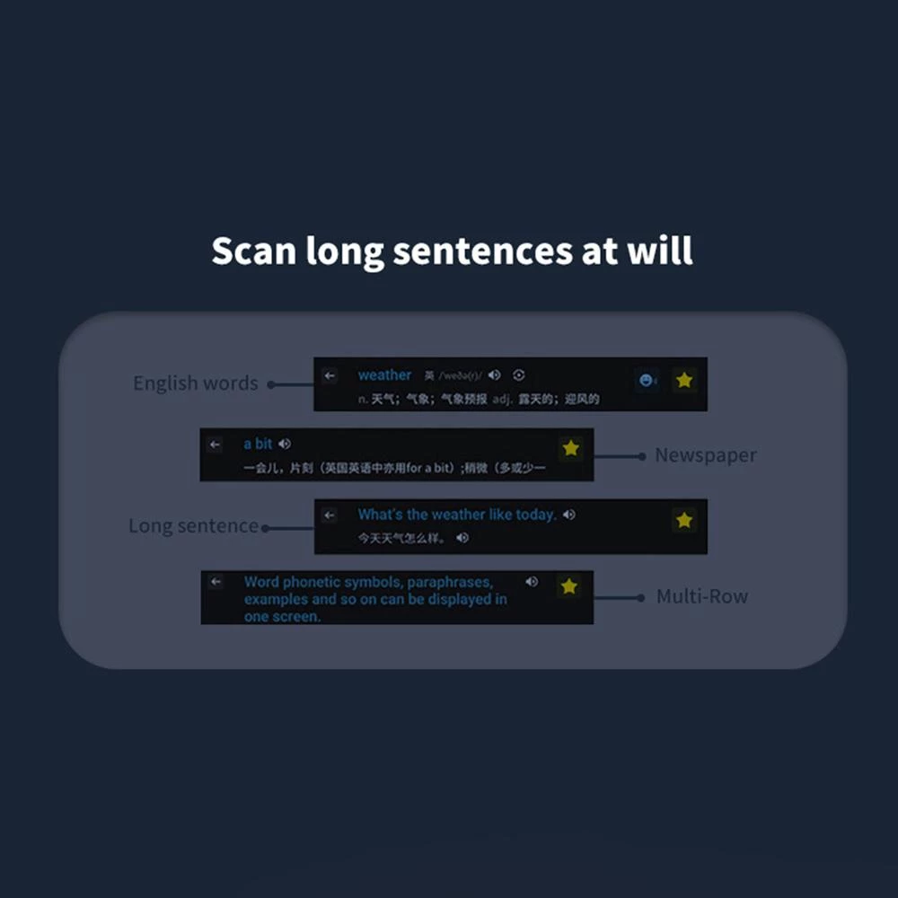 Especificação Nome: Caneta dicionário de digitalização inteligente Exibição: 5,6 cm/2,23 polegadas Tamanho: 173*31,5*14,8 mm/6,81*1,24*5,83 polegadas Suporte ao suporte: WiFi/Bluetooth Capacidade da bateria: 650 mAh Vida útil da bateria: 3-4 horas Interface de carregamento: typeC Entrada de energia: DC5V Descrição do produto Text PARA ESPEECH: Esta caneta de ponto e clique usa tecnologia OCR avançada para digitalizar palavras ou frases, suportando digitalização e tradução em 12 idiomas diferentes. O texto escaneado pode ser lido em voz alta no idioma alvo, que cuida muito das pessoas com dislexia e visão ruim. Translação DE FOTOS E RECORDAGEM INTELIGENTE: a caneta de digitalização é equipada com uma câmera HD de 5-megapixels e uma tela de toque grande de 3,5 polegadas. A caneta de ponta e chute suporta 12 traduções de fotos multilíngue, adequadas para tradução única de texto de parágrafo. Basta apontar a câmera em qualquer texto e a caneta traduzirá automaticamente. A fita de caneta digitalizadora ponto e chuteira também pode ser usada como gravador de fita útil para gravar e economizar todas as entrevistas importantes, reuniões e conversas. Texto MULTI-LINHA CANHAMENTO DE ALTA FERRATURA: A caneta pode digitalizar diferentes tipos de superfícies e fontes como: B. Texto impresso para computador, telas de computador, caligrafia, etc. Função Offline: Tradução fácil mesmo sem conexão com a internet, a caneta scanner de tradução também suporta função dicionário e banco de 10 palavras. A função Favoritos Favoritos permite visualizar as palavras ou frases que você precisa se concentrar a qualquer hora, em qualquer lugar. A caneta scanner embutida de alta capacidade. O tempo de espera é de 160 horas e o tradutor pode ser usado continuamente por 4 horas. Tradução em tempo Real em 116 idiomas: digitalize a caneta tradutora para traduzir online por voz, convertendo automaticamente o discurso em texto. Se você precisar falar com seus amigos estrangeiros, pode fornecer rapidamente uma experiência de comunicação transfronteiriça e superar barreiras linguísticas. Atenção de atenção Suporte offline offline 12 idiomas re-reconhecimento de digitalização – offline 12 idiomas offline 12 idiomas – offline 12 idiomas digitalização tradução de fotos de tradução; Translação de voz de 112 idiomas – excertos de digitalização de tradução de voz de vários idiomas – tradução de voz de vários idiomas – excertos de digitalização de tradução de voz fina de vários idiomas Lista de produtos: Caneta de leitura de ponto de digitalização de tradução de fala 1 * cabo de carregamento Manual de instruções