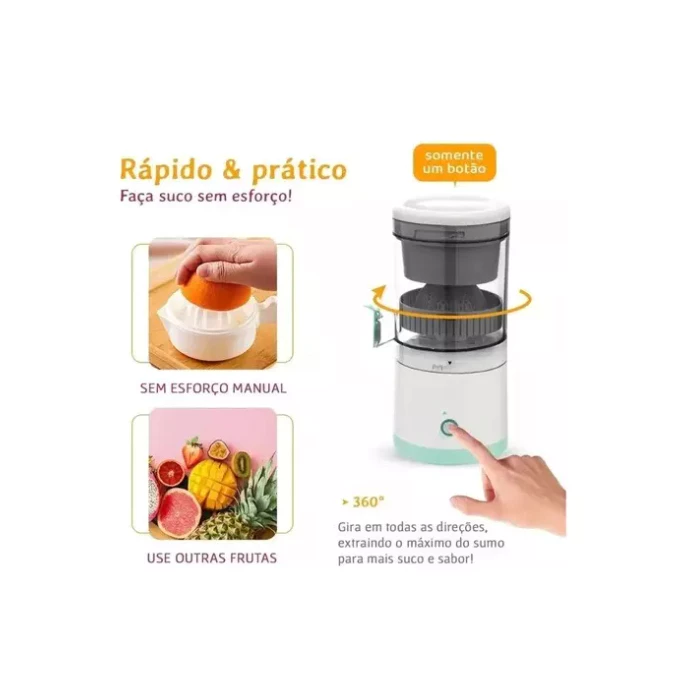Desfrute de deliciosos sabores de frutas com o seu mini Espremedor Esmagador De Frutas Elétrico Portátil. O produto é ideal para preparação de sucos de laranja, limonada, melancia, uva, e muito mais. RÁPIDO E SIMPLES: Em poucos segundos, você consegue preparar sua bebida de forma simples e com máximo aproveitamento da fruta. DESIGN MODERNO E ERGONÔMICO: O produto conta com um design simples e portátil, construído com material resistente em ABS, garantindo durabilidade e qualidade. CARACTERÍSTICAS: – Peso aprox.: 1100g. FICHA TÉCNICA: – Corrente nominal: 6A; – Modo de carregamento: USB; – Tensão nominal: 7.4V; – Potência nominal: 45W; – Requisitos de carregamento: 5V – 1A; ITENS INCLUSOS: – 01 Espremedor de frutas – 01 Cabo para carregamento. Duvidas sobre o produto contatar o chat do vendedor Cor enviado aleatório. Cor enviado aleatório.